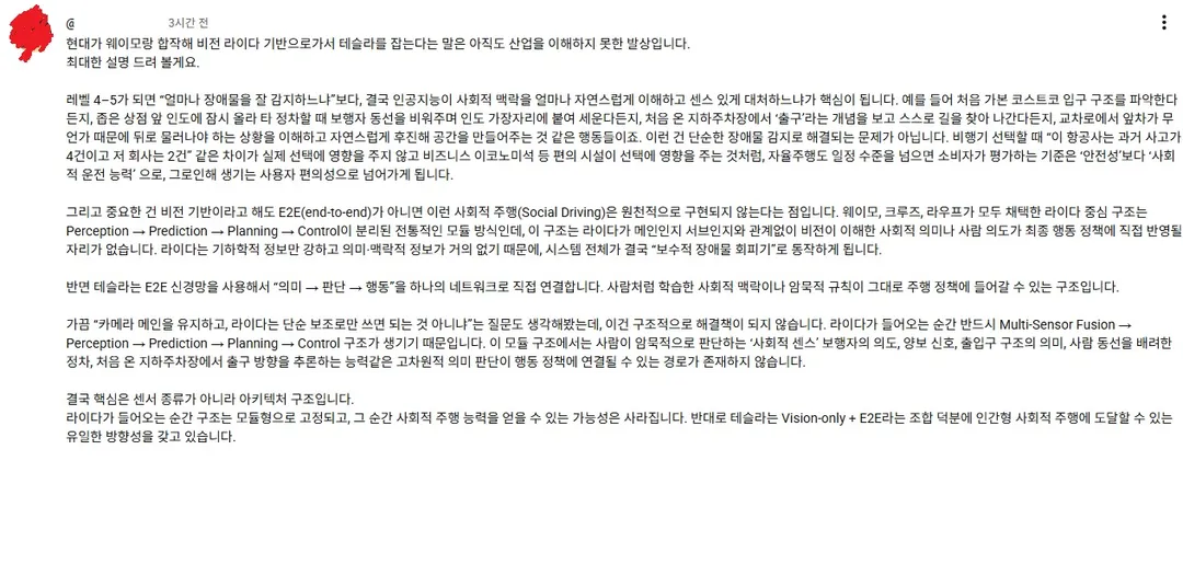 현대가 웨이모랑 합작해 비전 라이다 기반으로가서 테슬라를 잡는다는 말은 아직도 산업을 이해하지 못한 발상입니다. 최대한 설명 드려 볼게요. 레벨 4–5가 되면 “얼마나 장애물을 잘 감지하느냐”보다, 결국 인공지능이 사회적 맥락을 얼마나 자연스럽게 이해하고 센스 있게 대처하느냐가 핵심이 됩니다. 예를 들어 처음 가본 코스트코 입구 구조를 파악한다든지, 좁은 상점 앞 인도에 잠시 올라 타 정차할 때 보행자 동선을 비워주며 인도 가장자리에 붙여 세운다든지, 처음 온 지하주차장에서 ‘출구’라는 개념을 보고 스스로 길을 찾아 나간다든지, 교차로에서 앞차가 무언가 때문에 뒤로 물러나야 하는 상황을 이해하고 자연스럽게 후진해 공간을 만들어주는 것 같은 행동들이죠. 이런 건 단순한 장애물 감지로 해결되는 문제가 아닙니다. 비행기 선택할 때 “이 항공사는 과거 사고가 4건이고 저 회사는 2건” 같은 차이가 실제 선택에 영향을 주지 않고 비즈니스 이코노미석 등 편의 시설이 선택에 영향을 주는 것처럼, 자율주행도 일정 수준을 넘으면 소비자가 평가하는 기준은 ‘안전성’보다 ‘사회적 운전 능력’ 으로, 그로인해 생기는 사용자 편의성으로 넘어가게 됩니다. 그리고 중요한 건 비전 기반이라고 해도 E2E(end-to-end)가 아니면 이런 사회적 주행(Social Driving)은 원천적으로 구현되지 않는다는 점입니다. 웨이모, 크루즈, 라우프가 모두 채택한 라이다 중심 구조는 Perception → Prediction → Planning → Control이 분리된 전통적인 모듈 방식인데, 이 구조는 라이다가 메인인지 서브인지와 관계없이 비전이 이해한 사회적 의미나 사람 의도가 최종 행동 정책에 직접 반영될 자리가 없습니다. 라이다는 기하학적 정보만 강하고 의미·맥락적 정보가 거의 없기 때문에, 시스템 전체가 결국 “보수적 장애물 회피기”로 동작하게 됩니다. 반면 테슬라는 E2E 신경망을 사용해서 “의미 → 판단 → 행동”을 하나의 네트워크로 직접 연결합니다. 사람처럼 학습한 사회적 맥락이나 암묵적 규칙이 그대로 주행 정책에 들어갈 수 있는 구조입니다. 가끔 “카메라 메인을 유지하고, 라이다는 단순 보조로만 쓰면 되는 것 아니냐”는 질문도 생각해봤는데, 이건 구조적으로 해결책이 되지 않습니다. 라이다가 들어오는 순간 반드시 Multi-Sensor Fusion → Perception → Prediction → Planning → Control 구조가 생기기 때문입니다. 이 모듈 구조에서는 사람이 암묵적으로 판단하는 ‘사회적 센스’ 보행자의 의도, 양보 신호, 출입구 구조의 의미, 사람 동선을 배려한 정차, 처음 온 지하주차장에서 출구 방향을 추론하는 능력같은 고차원적 의미 판단이 행동 정책에 연결될 수 있는 경로가 존재하지 않습니다. 결국 핵심은 센서 종류가 아니라 아키텍처 구조입니다. 라이다가 들어오는 순간 구조는 모듈형으로 고정되고, 그 순간 사회적 주행 능력을 얻을 수 있는 가능성은 사라집니다. 반대로 테슬라는 Vision-only + E2E라는 조합 덕분에 인간형 사회적 주행에 도달할 수 있는 유일한 방향성을 갖고 있습니다. ---------