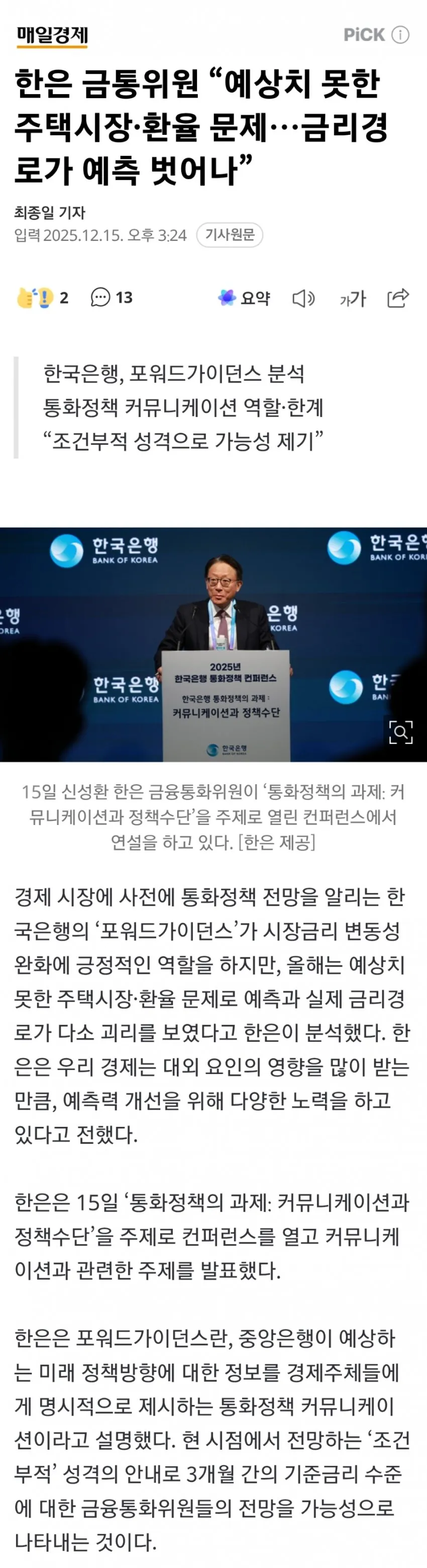 유머 한은 금통위원 “예상치 못한 주택시장·환율 문제…금리경로가 예측 벗어나” 🖼️