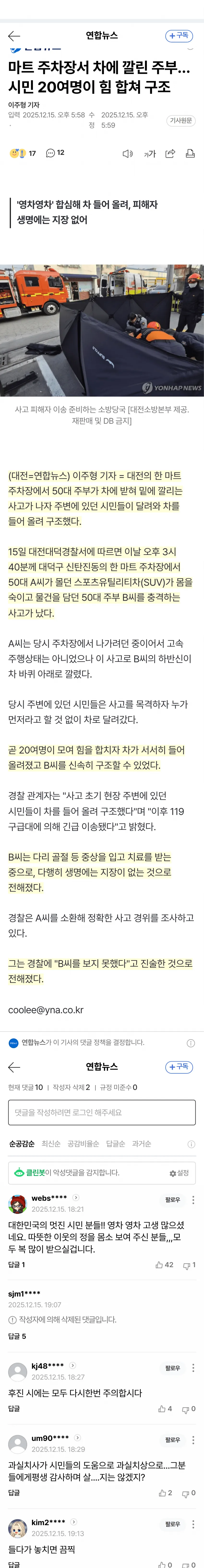 유머 마트 주차장서 SUV에 깔린 주부 시민들이 차 들어 올려 구조 🖼️