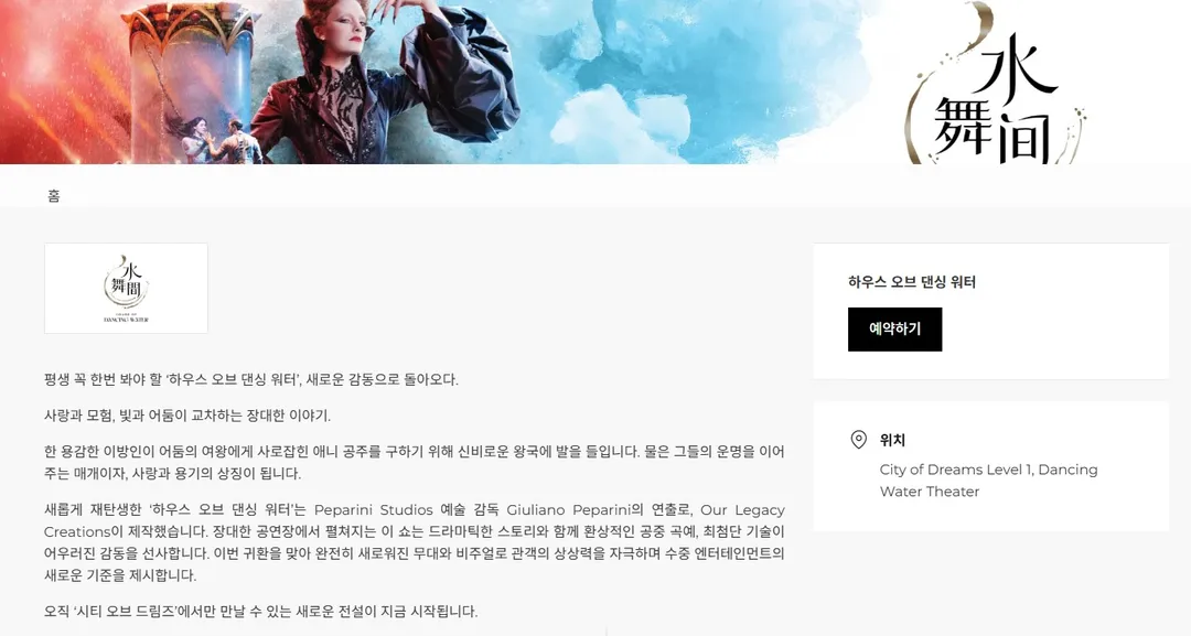 마카오 가면 꼭 봐야하는 공연 '하우스오브댄싱워터 (House of Dancing Water)' 공식홈페이지 주소